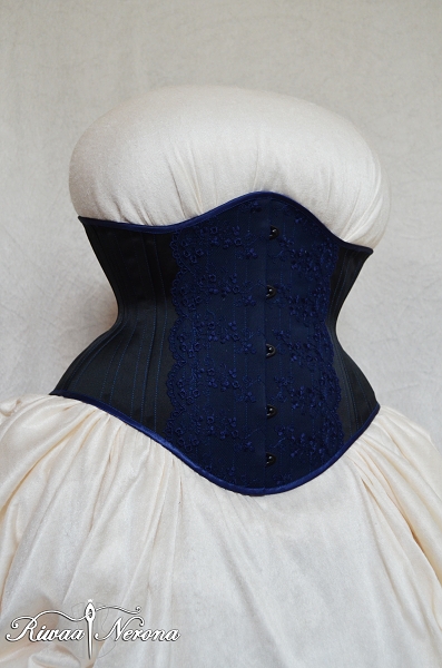 Korzet určený pro časté nošení je ušit z černého matnějšího saténu vysoké gramáže, zdobený modrou ručně našívanou krajkou v přední části a kontrastním proševem v modré.