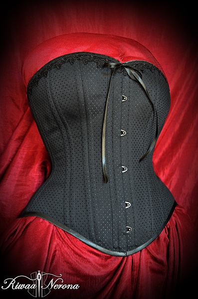 Korzet ze speciálního materiálu pro výrobu korzetů – coutile s puntíky. Materiál dodává korzetu vysokou pevnost a chrání jej proti vytažení i při velmi častém nošení. Tento korzet má navíc i nosnou podšívku též ze speciálního korzetového plátna. Tužen je dále silnými plastovými kosticemi, zapíná se na černé korzetové háky a šněruje díky černým průchodkám. S lesklými puntíky korzetu ladí lesklé lemování, ručně našívaná krajka na horním srdíčkovém okraji, a ozdobné šněrování stuhou.